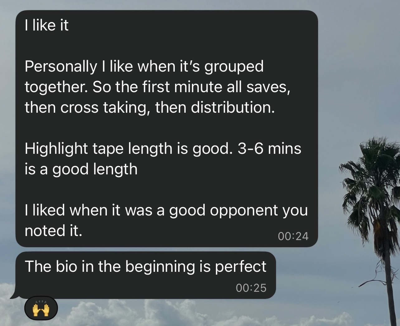 Group your clips by skill: all saves first, then cross-taking, then distribution. Aim for 3–6 minutes total. Note when you're facing a strong opponent, and make sure your bio appears at the start of the video.